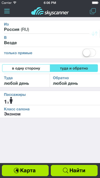 Если вы деловой человек и постоянно летаете на самолетах, программа для поиска дешевых авиабилетов вам просто необходима. А еще лучше, если это будет мобильное приложение для вашего телефона, которое всегда будет под рукой. Сегодня речь пойдет о программе Skyscanner, которую скачали в AppStore более 30 миллионов людей. Приложение позволяет за несколько секунд найти и сравнить миллионы рейсов от сотен авиакомпаний. Купить авиабилет сегодня гораздо проще чем вы думаете! Доступна огромная база данных авиарейсов по всему миру. Приложение поможет найти билеты, как на бюджетные, так и регулярные рейсы, поэтому пользователь может найти привлекательные предложения в разных ценовых диапазонах. Как работает программа? 1. Вы находите и выбираете нужный рейс из тысячи предложений. 2. Skyscanner переадресовывает вас на сайт авиакомпании или туристического агенства. 3. Вы покупаете билет непосредственно на сайте компании-перевозчика без каких-либо комиссий. Особенности: •Функция поиска «Везде» – хотите уехать, но не знаете куда? Позвольте нам вдохновить вас – просто укажите пункт отправления и выберете «Везде», как пункт назначения. •Фильтруйте результаты поисков по цене, классу обслуживания, авиакомпании, времени вылета и прилета. •Режим диаграммы поможет увидеть динамику цен на протяжении недели или месяца •Функция виртуального глобуса покажет наиболее выгодные предложения на авиарейсы в любую точку мира из вашего города •Приложение доступно на 30 языках | |