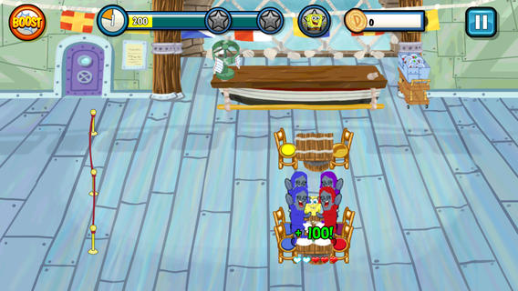 Команда разработчиков предлагает вам поработать официантом в увлекательной игре по вселенной SpongeBob. Вы пройдете путь от работника обычной забегаловки до профессионала, работающего в пятизвездочном отеле. Всего в игре пять заведений различного класса обслуживания. От вас требуется помочь главному герою обслуживать и удовлетворять желудки клиентов. Управление предельно простое - хватаете Спэнч Боба и отправляете его к покупателям. Принимайте заказы, усаживайте покупателей и собирайте чаевые. Все ради процветания вашего ресторана!