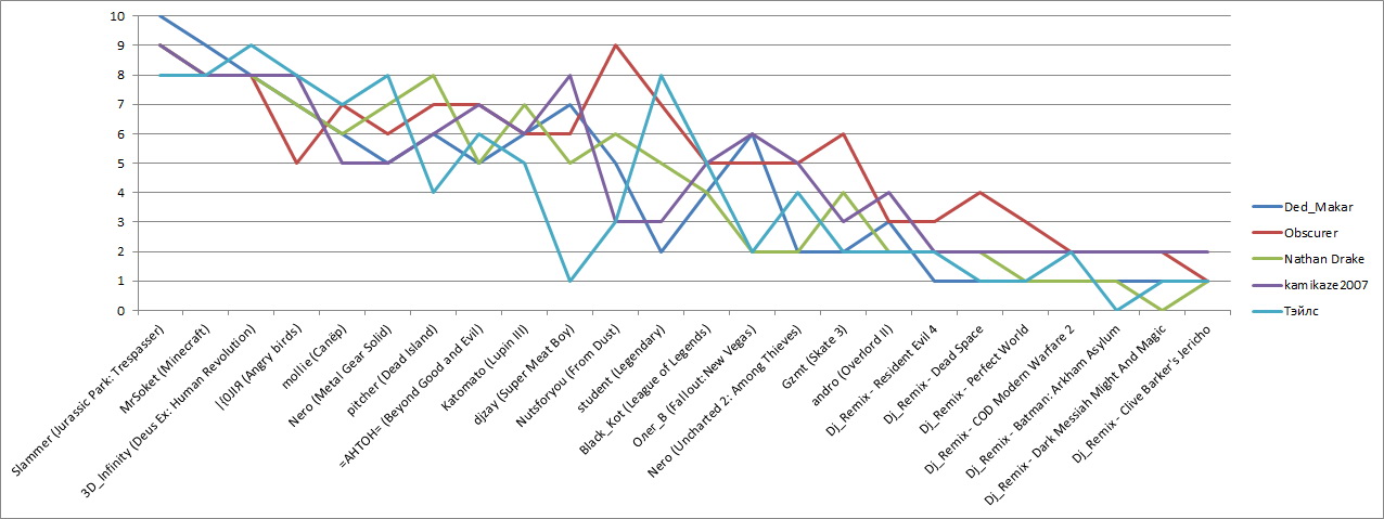 Итак, итоги конкурса! Спасибо всем за участие! Консольщики вас не забудут! 1 МЕСТО: 45 баллов ![]() Slammer (Jurassic Park: Trespasser) Получает 500 гигабайт аплоада, медаль и вещественный приз 2 МЕСТО: 41 балл ![]() MrSoket (Minecraft) Получает 250 гигабайт аплоада и вещественный приз 2 МЕСТО: 41 балл ![]() 3D_Infinity (Deus Ex: Human Revolution) Как участник клана, благородно отказался от приза. Аплодисменты ему 3 МЕСТО: 35 баллов ![]() |{0JIЯ (Angry birds) Получает 100 гигабайт аплоада. | |